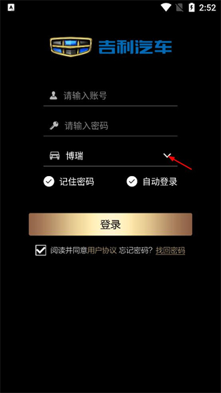 1、打开吉利汽车软件,找到车型选择栏右侧的下拉箭头,点击展开车型列表。