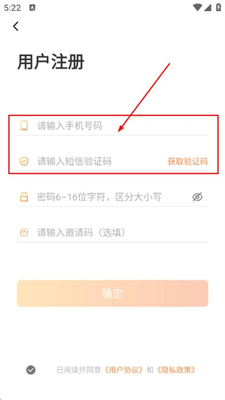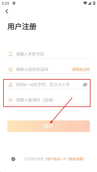 4、在用户注册页,填写密码及选填的邀请码后,点击确定完成注册操作。
