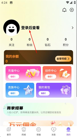 2、在个人中心页面,点击登录后查看区域,可进入用户登录页面。