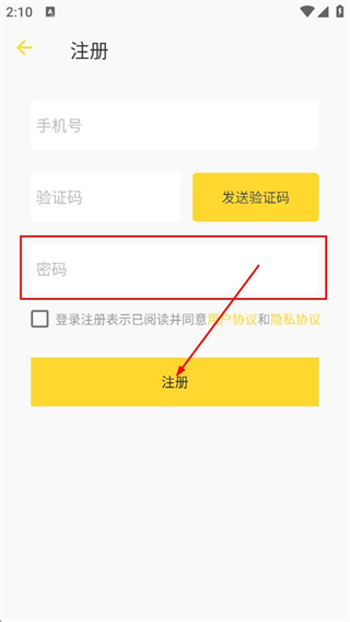 3、在注册页,填写密码,勾选协议后点击注册,完成注册。