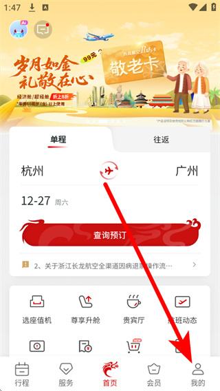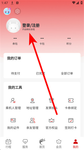 1、打开长龙航空,点击底部导航栏的我的选项,进入个人中心页面。