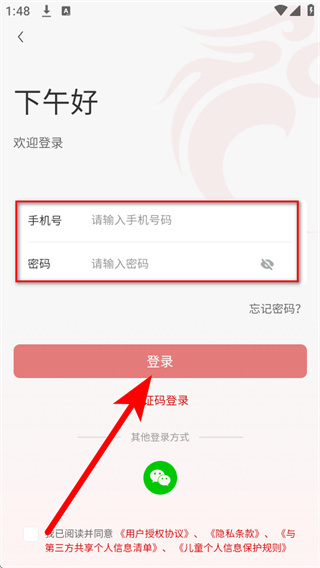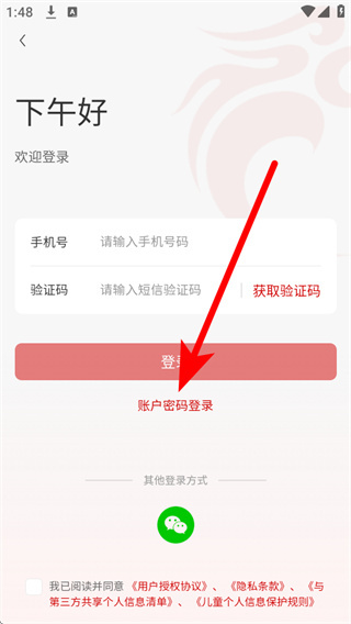 4、在账号密码登录页面,依次填写账号密码,勾选相关协议后,点击登录完成账号登录。