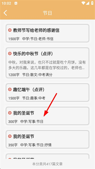 2、在分类页面,点击目标体裁分类,可进入对应体裁的作文列表页面。