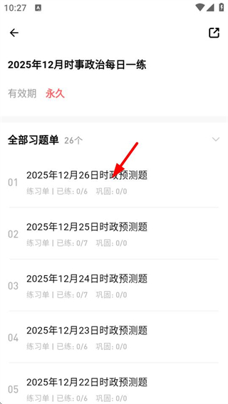 1、进入时政题库后,点击每日一练选项,可进入每日一练的习题单列表页面。