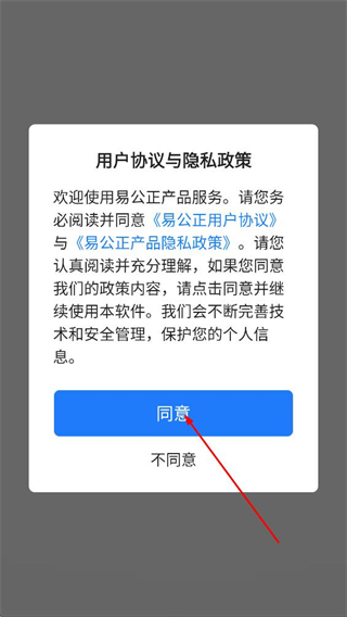 1、阅读用户协议与易公正产品隐私政策后,点击同意。