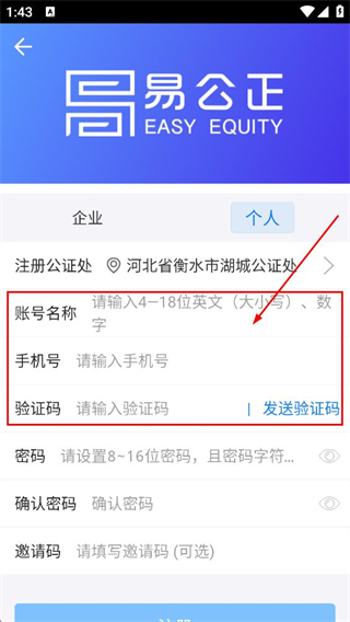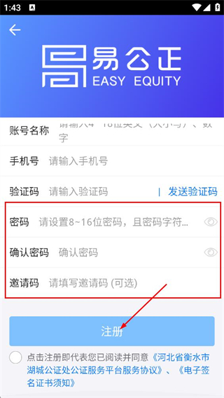 4、在注册页填写密码、确认密码邀请码后,点击注册,完成操作。