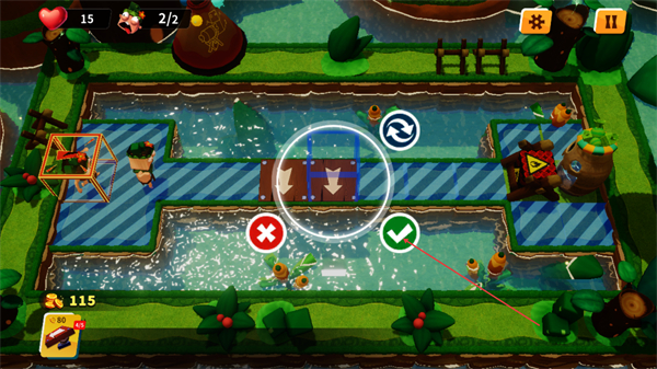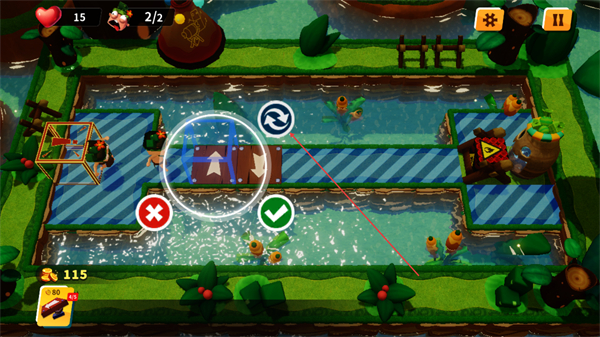 1、在水道关卡中,调整木板方向选向下箭头,点击√确认,规划角色移动路径。