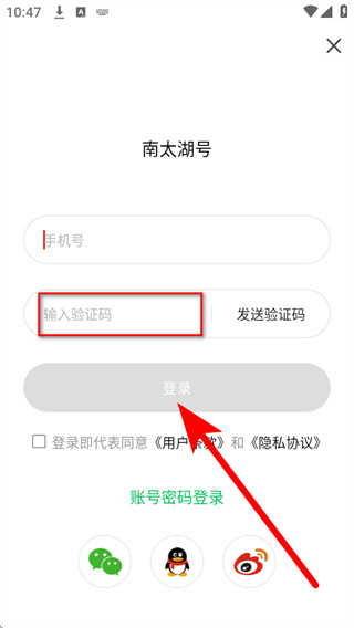 4、将收到的短信验证码填入验证码栏,勾选相关协议后,点击登录完成账号登录。