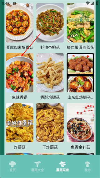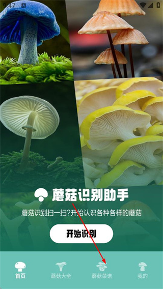1、进入首页后,点击底部的蘑菇菜谱选项,可进入蘑菇菜谱页面