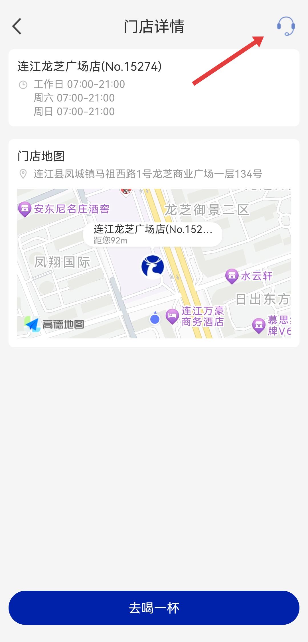 2、在门店详情页面右上角,找到耳机形状的客服图标并点击,跳转至在线客服聊天界面。