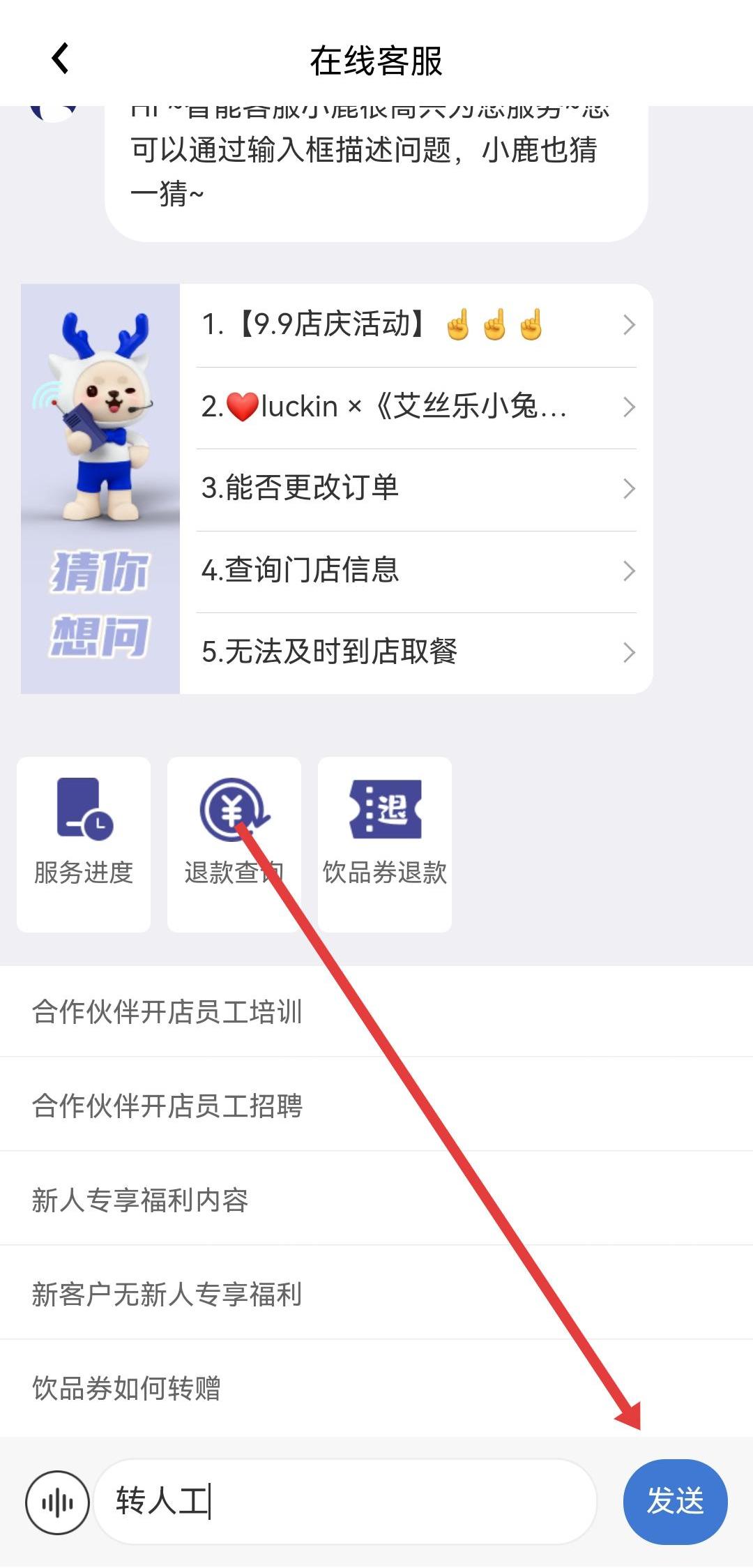 3、在在线客服的底部输入框中,输入转人工字样,点击右侧蓝色发送按钮,发送后等待系统响应。