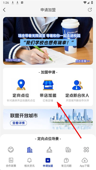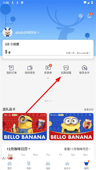 2、在我的页面中,找到招商加盟选项并点击,进入瑞幸咖啡的加盟介绍页面。