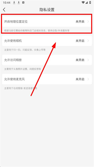 4、在隐私设置界面,点击地理位置定位对应选项,即可设置权限功能。