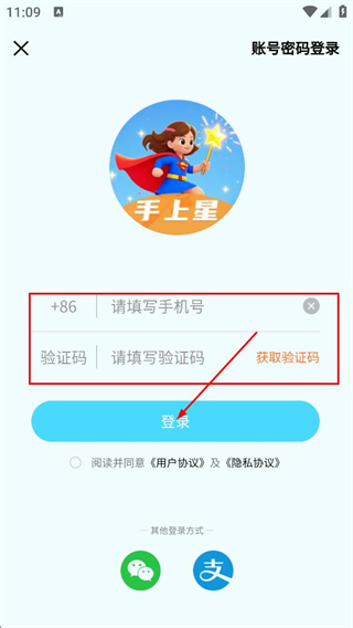 4、在登录页填写手机号,点击获取验证码后填写验证码,点击登录。