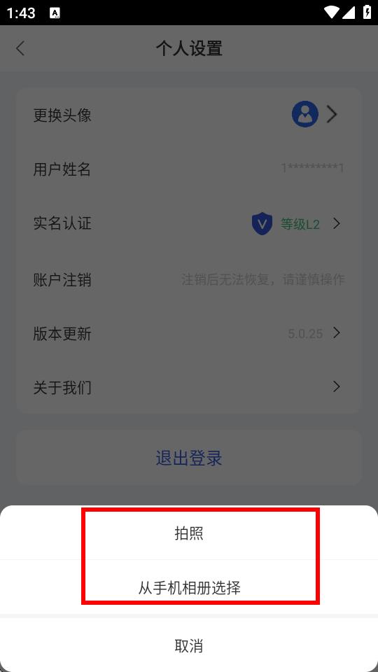 4、在弹出的选项中,选择拍照或从手机相册选择,即可完成头像更换。