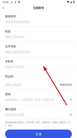 4、在注册界面,依次填写登录账号信息,获取并填写验证码,设置密码后点击注册完成操作。