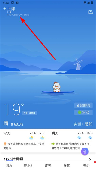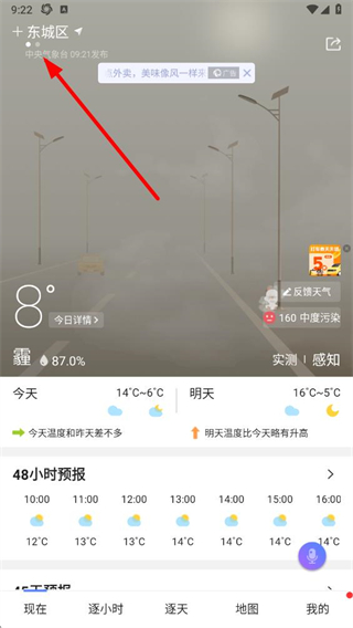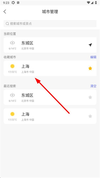 1、在中国天气app天气页面点击左上角城市名称区域,进入城市管理页面。
