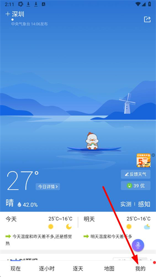 1、打开中国天气APP,在主界面点击下方导航栏中的逐天选项。