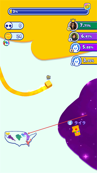 3、持续扩张区域,进度升至3%,金币达24,避开其他玩家,继续占据更多区域。