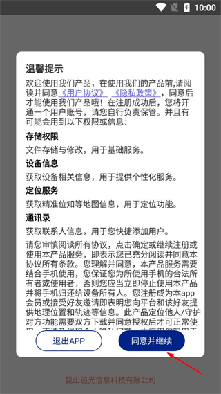 1、阅读弹出的温馨提示内容,了解相关权限说明后,点击同意并继续按钮。