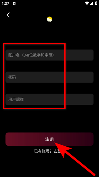 4、在注册页面,输入账户名、密码、用户昵称,点击注册,完成账号创建。