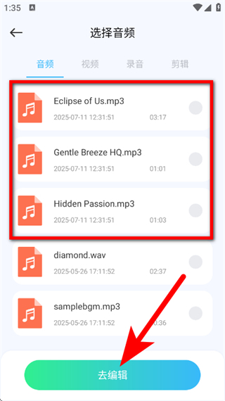 2、在选择音频页面,选中目标音频,点击去编辑,进入音频剪辑页面。
