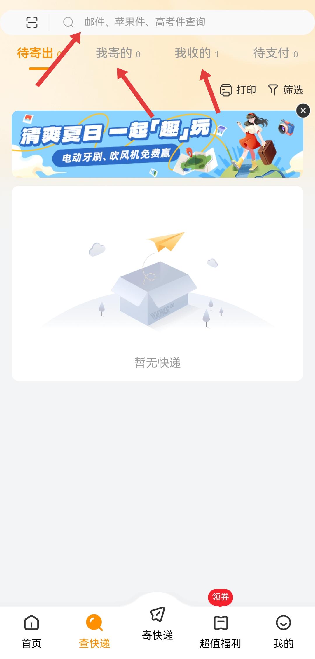 1、打开邮政EMSAPP,切换至底部导航栏的查快递页面,可通过搜索栏输入单号查询,或点击我寄的、我收的标签查看对应快递记录。
