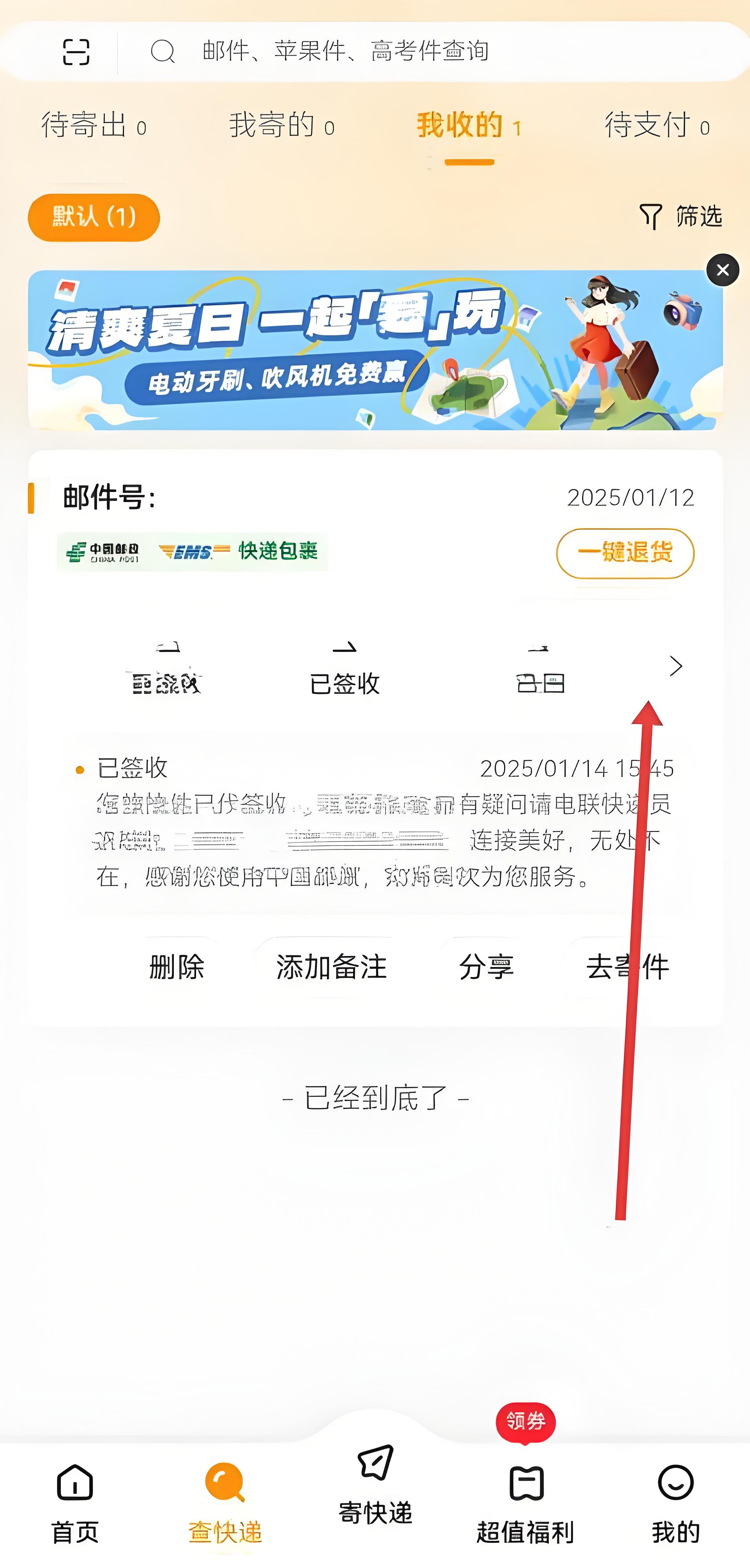 2、这里我们点击我收的快递记录列表中,点击需要查询的快递条目,进入该快递的详情页面。