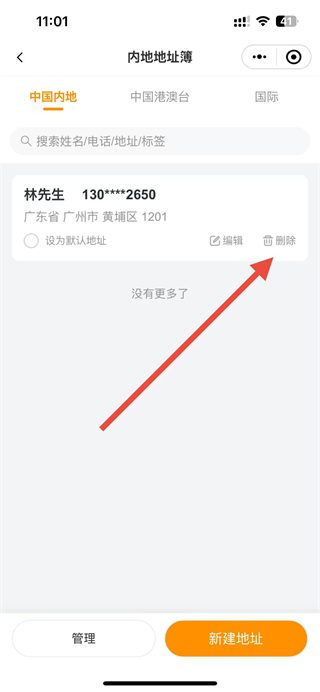 3、在内地地址簿页面中,找到要删除的地址,点击其右侧的删除选项。