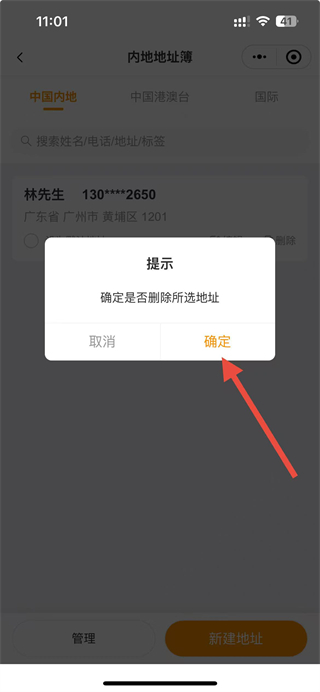 4、在弹出的提示框中,点击确定按钮即可删除所选地址。