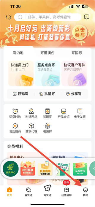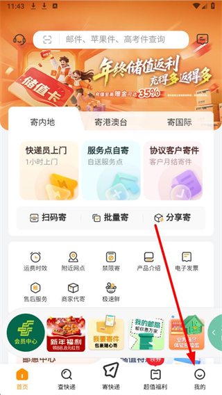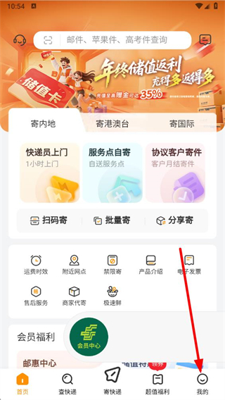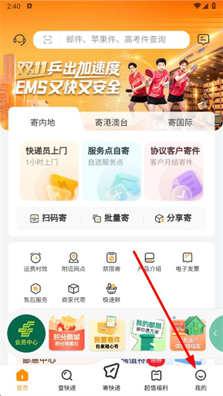 1、打开邮政EMS软件,在首页点击右下角我的选项。