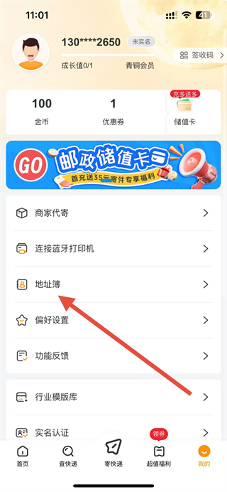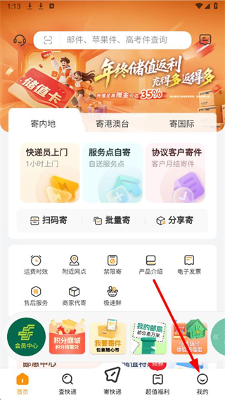 1、打开邮政EMS软件,在首页点击右下角我的进入个人页面。