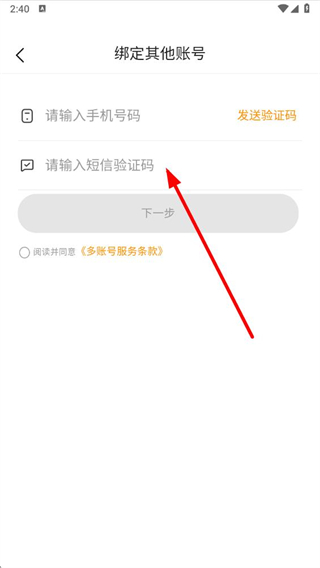 4、在绑定其他账号页面,输入手机号码并获取验证码,输入验证码后勾选同意条款,点击下一步完成绑定。