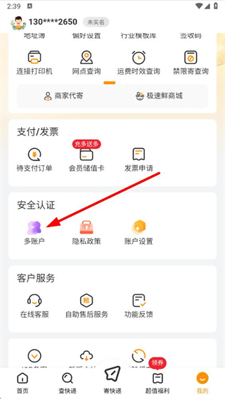 2、在个人页面的安全认证板块中,找到并点击多账户选项。