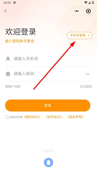 3、在登录页面里,选择右上角的手机号登录选项,切换至手机快捷登录界面。
