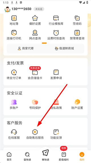 2、进入个人中心后,找到自助售后服务选项并点击,进入售后服务页面。