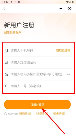 4、在页面依次填写手机号、获取验证码,设置密码,勾选协议后,点击注册完成账号注册。