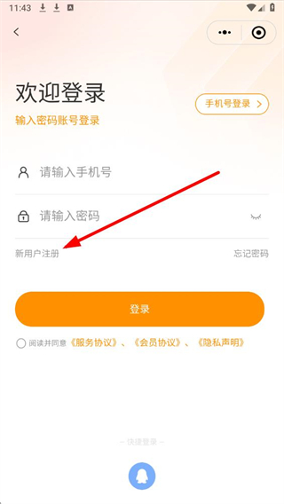 3、进入登录界面后,点击新用户注册选项,切换至新用户注册页面。