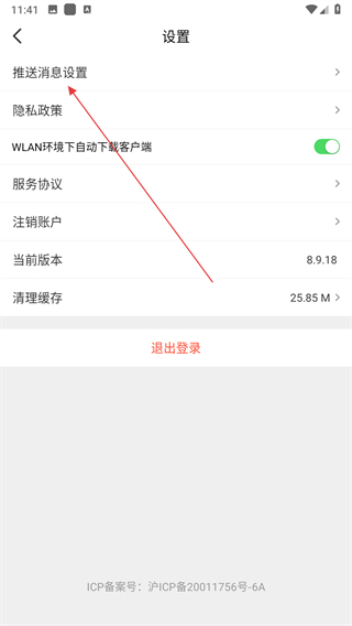 3、点击推送消息设置选项,进入推送消息设置页面。