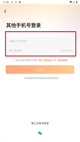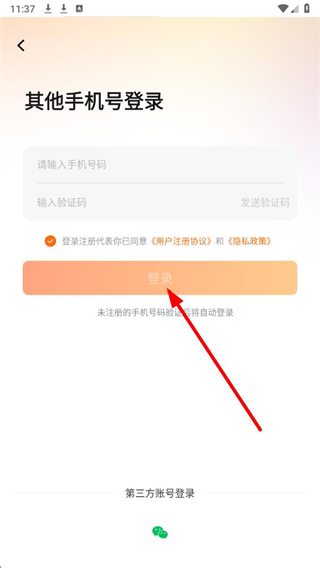 2、在登录页面,在输入框中填写手机号码,点击发送验证码,将收到的验证码填入。