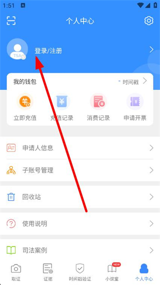 2、进入个人中心页面后,点击上方登录/注册区域。