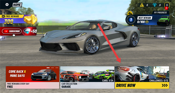 1、在游戏主界面,点击DRIVE NOW按钮,进入模式选择页面,准备开启赛车竞速挑战。