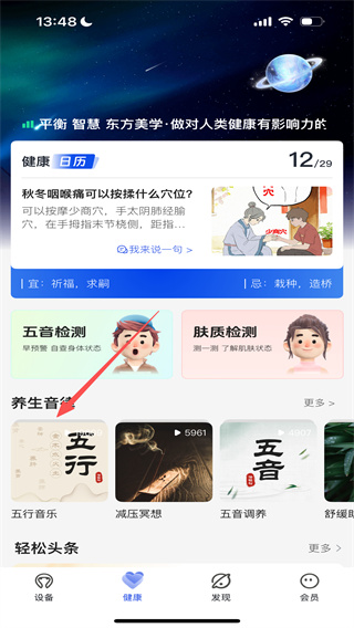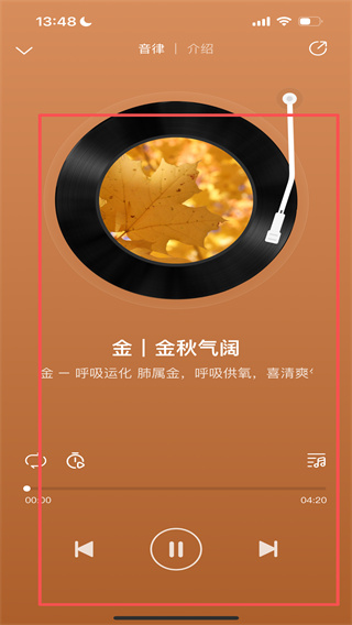 2、在健康页面,点击养生音乐板块下的目标音频,可进入该音频的播放页面。