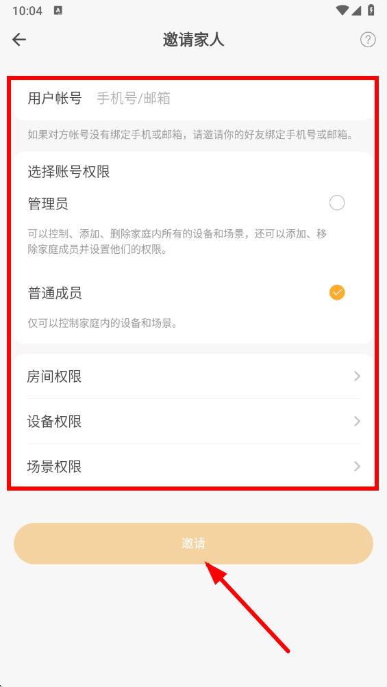 5、在邀请家人页面,输入对方的用户帐号,选择账号权限,还可对房间权限、设备权限、场景权限进行设置,设置完成后点击邀请,即可发出家庭成员添加邀请。