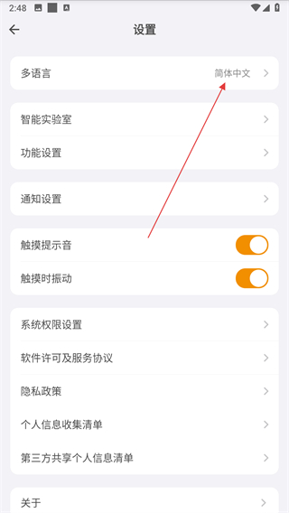 3、在设置页面点击多语言,进入多语言选择。