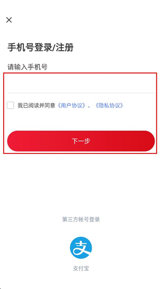 4、在登录页面填写手机号码,勾选相关协议后点击下一步按钮继续登录流程。