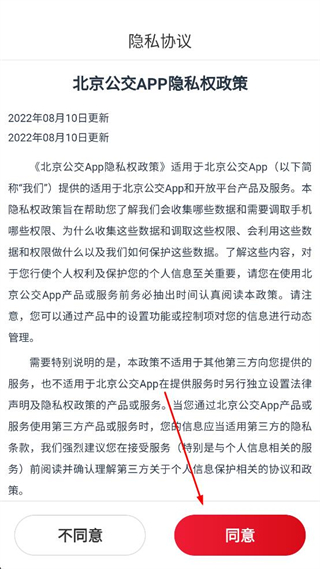 1、阅读北京公交APP的隐私协议内容,确认后点击同意按钮进入APP主界面。