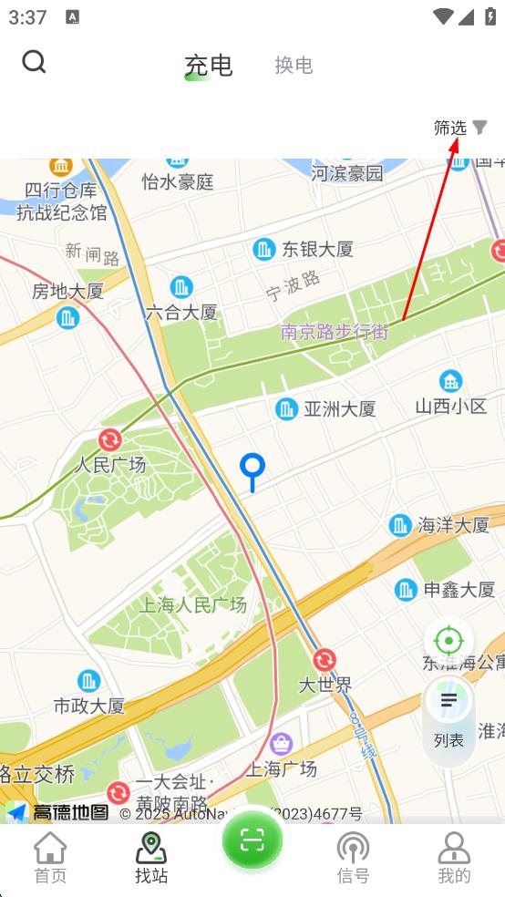 3、进入充电地图页面,点击右上角筛选按钮,按需筛选站点条件,精准查找符合需求的充电站点。