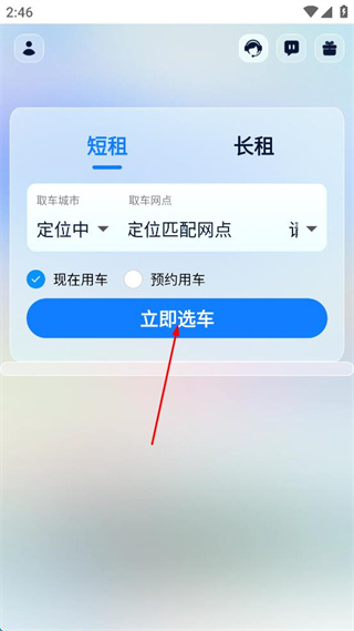 3、登录后返回主页面,确认短租选项已选中,取车城市和网点处于定位中状态。
