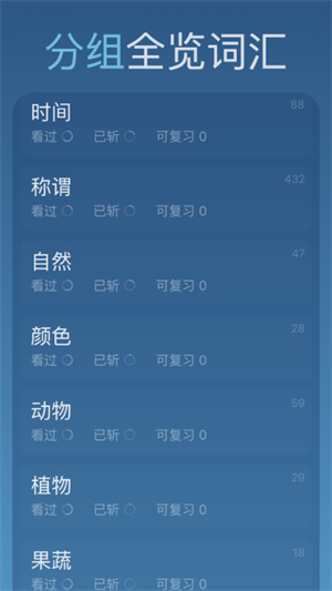- 可以帮助用户记住更多的单词用,户可以知道他们看到的单词数量和可以复习的单词数量;